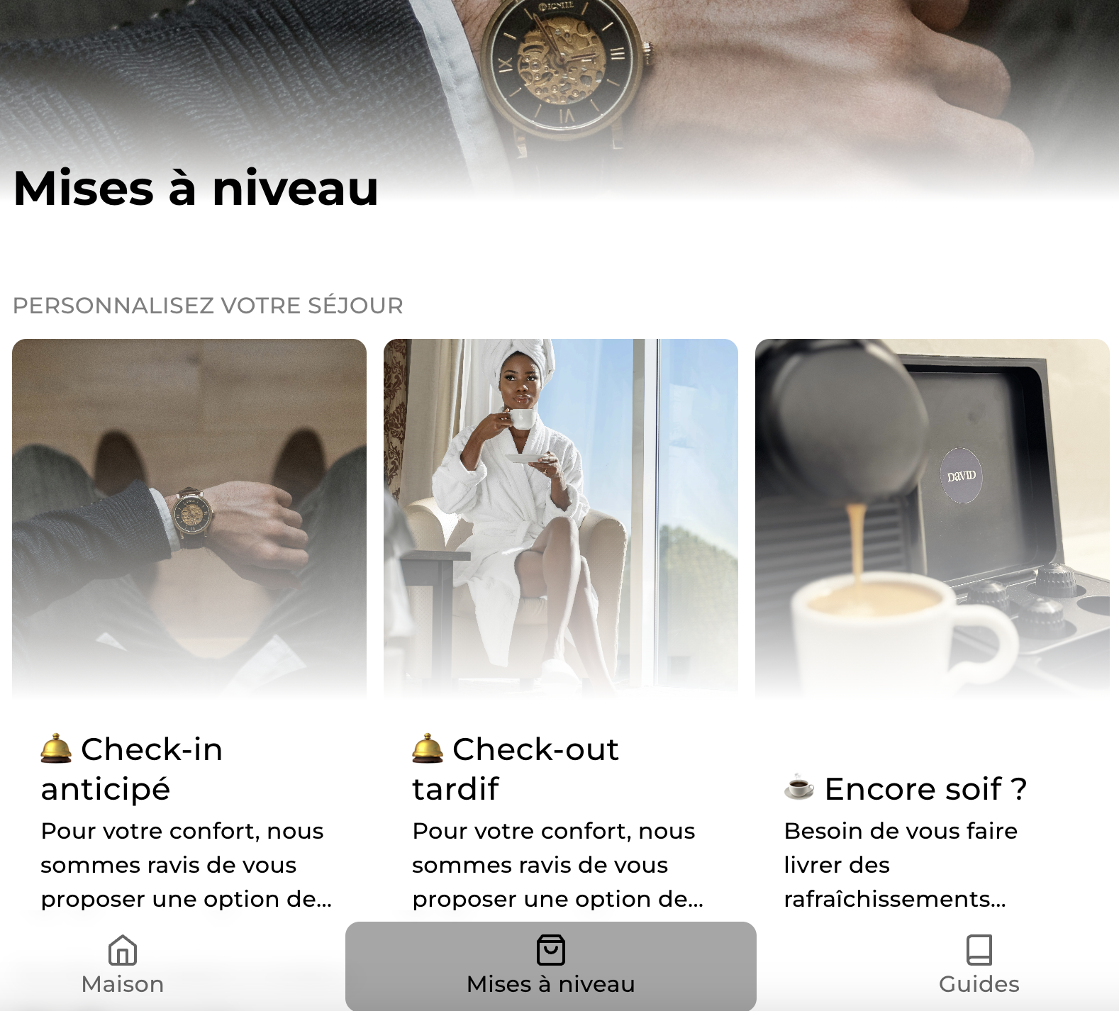 Sous réserve de disponibilité, vous pouvez facilement demander une arrivée anticipée ou un départ tardif via votre boarding pass numérique. Il vous suffit de consulter la section "Mises à niveau" sur votre boarding pass.